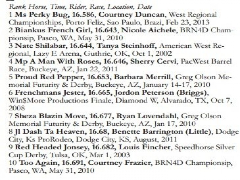| 10 | Too Again | 16.691 | Courtney Frazier | BRN4D Championsip | Pasco, WA | May 31, 2010 |